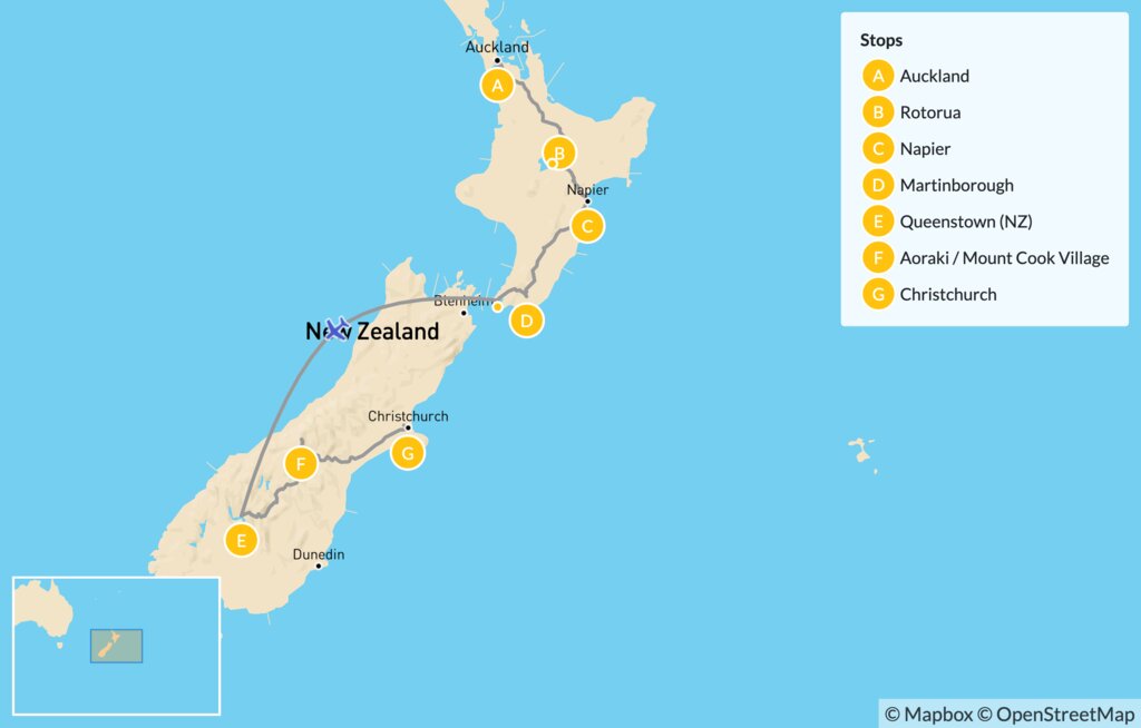 Map of New Zealand Luxury Highlights: Road Trip Through the North & South Islands – 14 Days