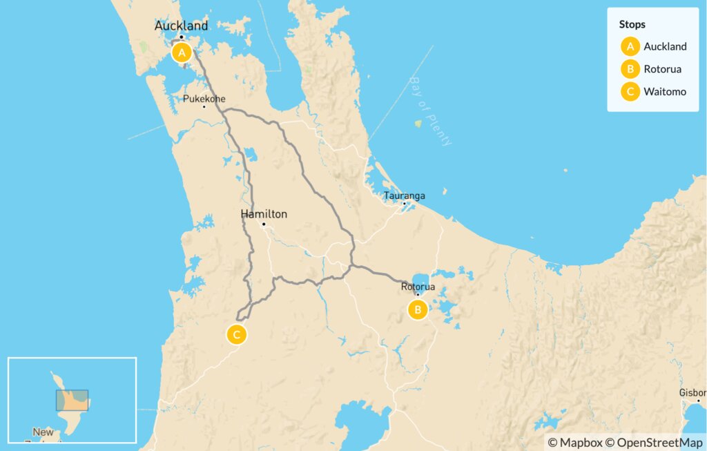 Map of New Zealand North Island Family Adventure: Dolphins, Glowworms & Hobbiton – 7 Days