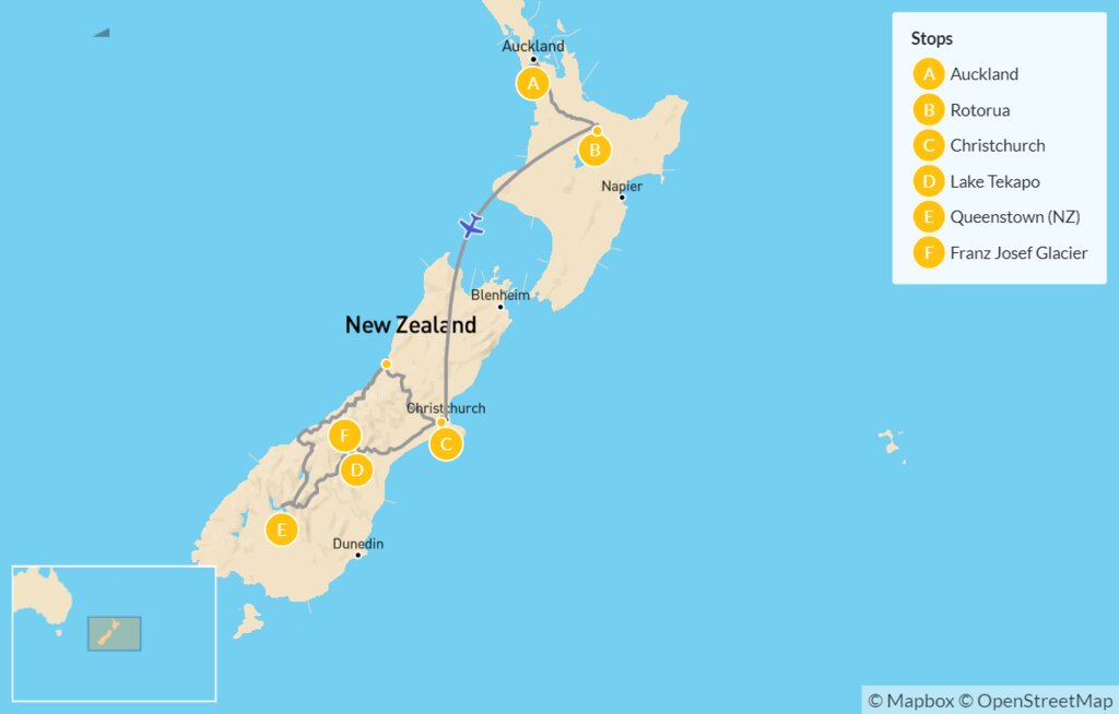 Eager to explore the vast beauty of New Zealand without driving? This two-week itinerary uses convenient transfers, buses, and flights to ensure you experience the country’s top highlights, from cities to countryside. Start in Auckland and travel south to the wonders of Rotorua before flying to the South Island. Take a dramatic bus trip from Christchurch to Lake Tekapo, then continue to Queenstown and Franz Josef / Waiau Glacier. Finally, ride the TranzAlpine Scenic Train back to the city.