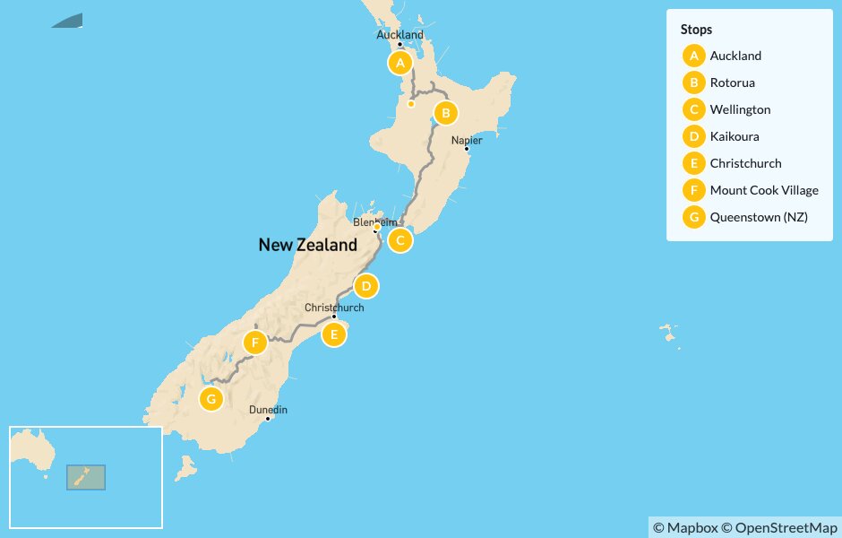 Map of New Zealand Scenic Self-Drive Tour: Auckland, Rotorua, Wellington, Canterbury & Otago – 11 Days