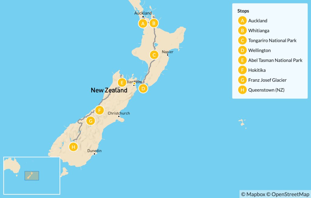 Map of New Zealand Self-Drive Wilderness Tour – 19 Days