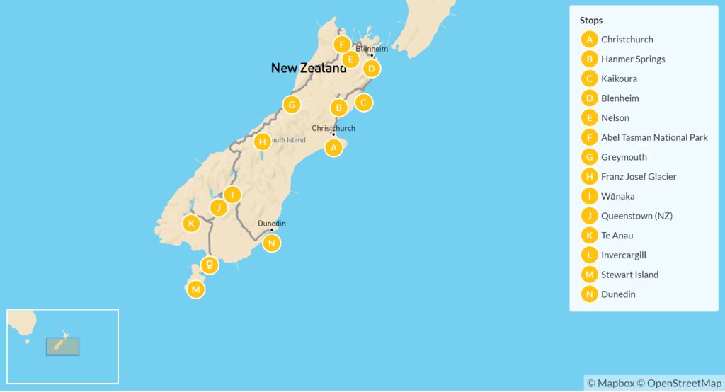 This fast-paced 20-day road trip takes you through the best of New Zealand’s South Island for travelers who want to see it all. Tram through Christchurch, relax at a spa in Hanmer Springs, explore the Marlborough wine region, and kayak in Abel Tasman National Park. Then enjoy some trekking at Franz Josef / Waiau Glacier, go skydiving in Wānaka, and try out bungee jumping in Queenstown. You’ll also visit Stewart Island, Dunedin, and the Otago Peninsula, before returning to Queenstown.