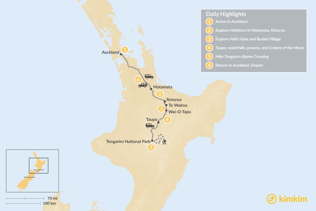 From Auckland to Taupo, this six-day itinerary presents the highlights of the North Island’s diverse and dramatic landscapes. You’ll trek amid emerald lakes and ancient volcanoes, explore The Shire from “Lord of the Rings,” and discover the sacred thermal waters of Wai-O-Tapu._x000D_