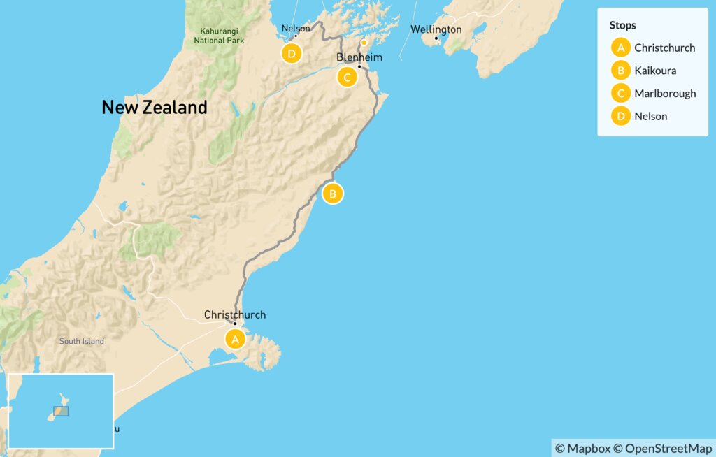 | Day 6 | Marlborough Wine Tasting, Water Taxi to Nelson, Free Time | Nelson |