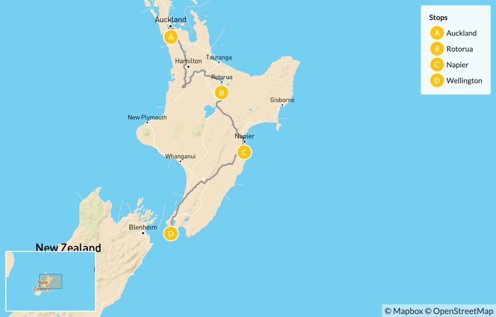 Start your day exploring Rotorua’s famous geysers, bubbling mud holes, steaming vents, and sulfurous pools at Wai-O-Tapu. Choose short walks showcasing the distinctive landscapes and volcanic activity, including the famous Mud Pool. Learn about the Lady Knox Geyser with a guide, then watch it erupt to huge heights. After, make the three-hour drive to Napier, a coastal city set among the vineyard-grooved landscape of Hawke’s Bay.