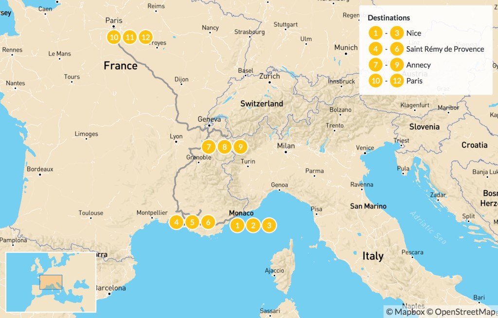 Map of Nice, Provence, Paris & the French Alps – 14 Days