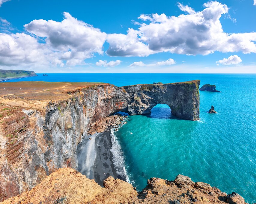 Next up is Skógarfoss. Located barely a mile outside the town of Skógar, this thundering waterfall cascades 200 feet (60 m) over a cliff into the Skógá River. Then, near the southernmost tip of Iceland, you’ll stop at Dyrhólaey, a 393-foot (120 m) rock promontory whose name derives from its massive natural arch (Dyrhólaey translates to “door-hole”). After enjoying the views, you can stroll the black sands of Reynisfjara Beach, whose jagged rock formations lend it an otherworldly quality.