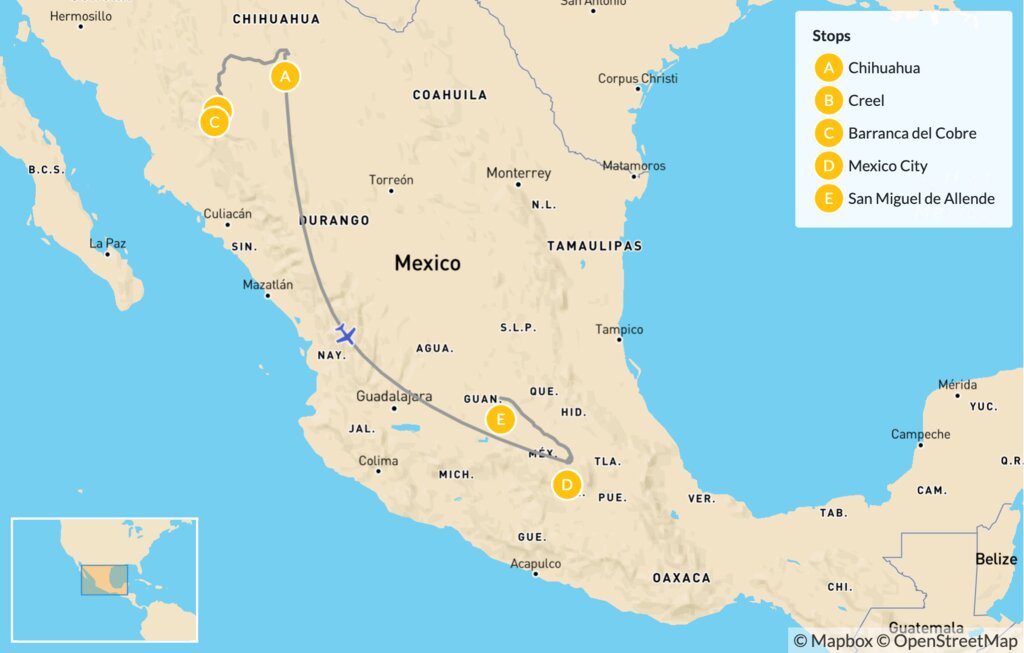 Map of North & Central Mexico: Chihuahua to Mexico City – 13 Days