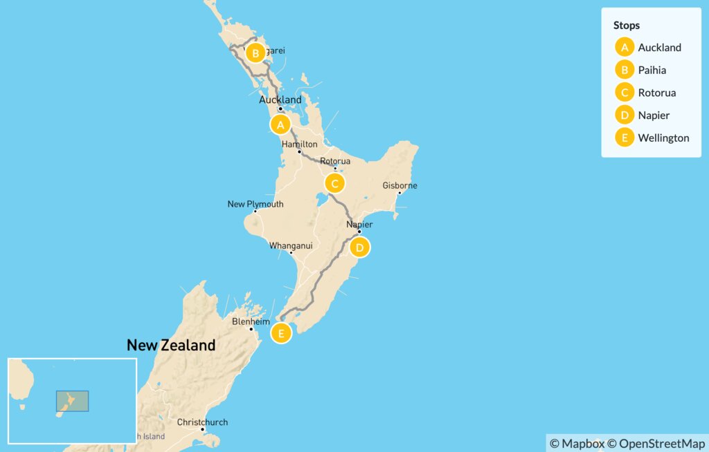 Map of North Island Road Trip: Auckland, Bay of Islands, Rotorua, Napier & Wellington – 11 Days