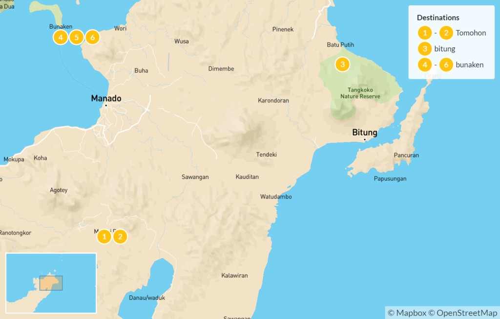 Map of North Sulawesi: From Coral Reefs to Active Volcanoes – 7 Days