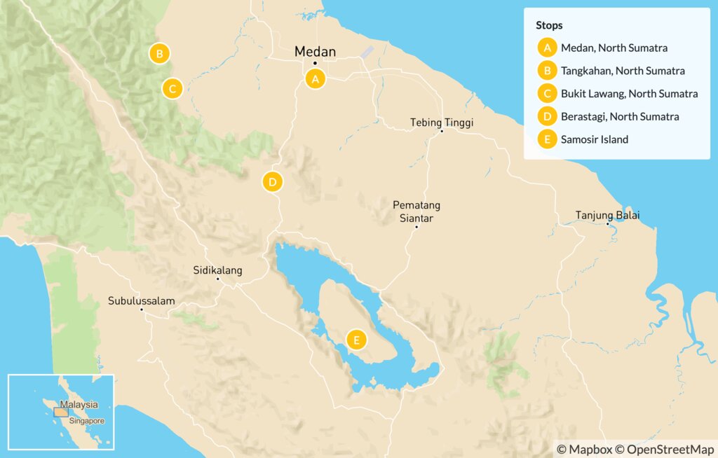 Welcome to the island of Sumatra, Indonesia! Meet your English-speaking guide at the airport and drive to the center of North Sumatra’s capital of Medan. The city is a melting pot of Chinese, Malay, Indian, and Batak cultures, dotted with reminders of its Dutch colonial past. Start with a walking tour of the city, beginning at the central Merdeka Square and the colonial-era buildings lining Kesawan Street, then continuing to the old post office and city hall. Break for lunch at a historic 1930s restaurant, where you’ll enjoy a delicious meal.