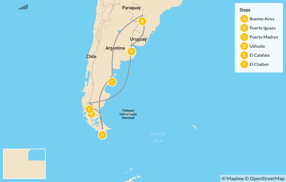 Map of North to South in Argentina: Buenos Aires, Iguazú Falls, Península Valdés & Patagonia – 15 Days