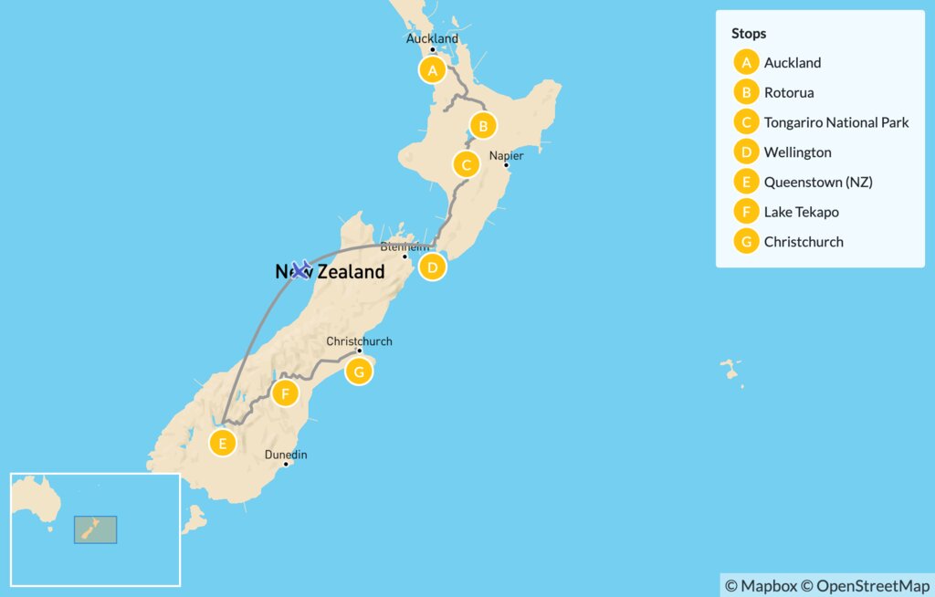 Map of North to South New Zealand Family Trip: Nature, Cities & Adventure – 14 Days