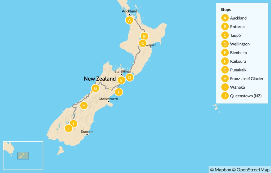 Map of North to South New Zealand Luxury Road Trip: Auckland to Queenstown – 14 Days