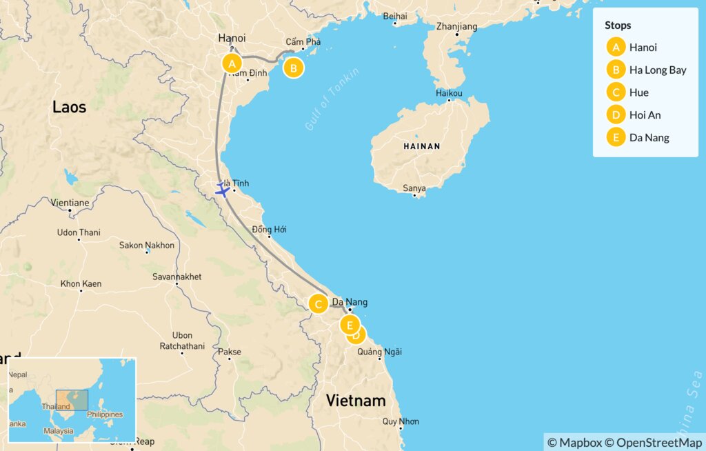 Map of Northern & Central Vietnam: Hanoi, Ha Long Bay, Hue & Hoi An – 9 Days