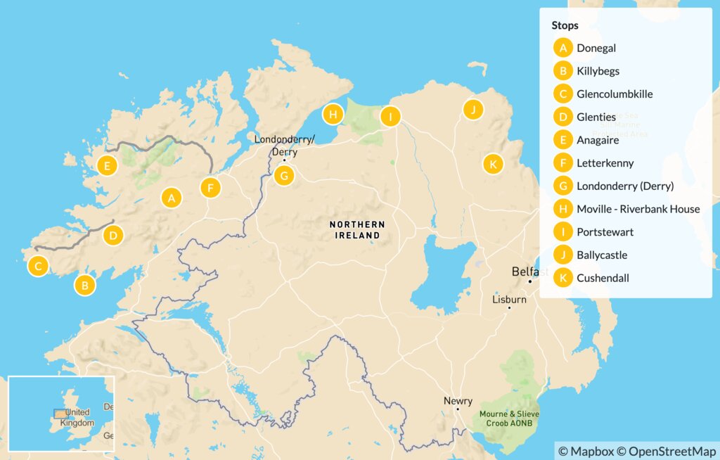 Map of Northern Ireland by Bike: Donegal, Glenveagh National Park & Giant’s Causeway -14 Days