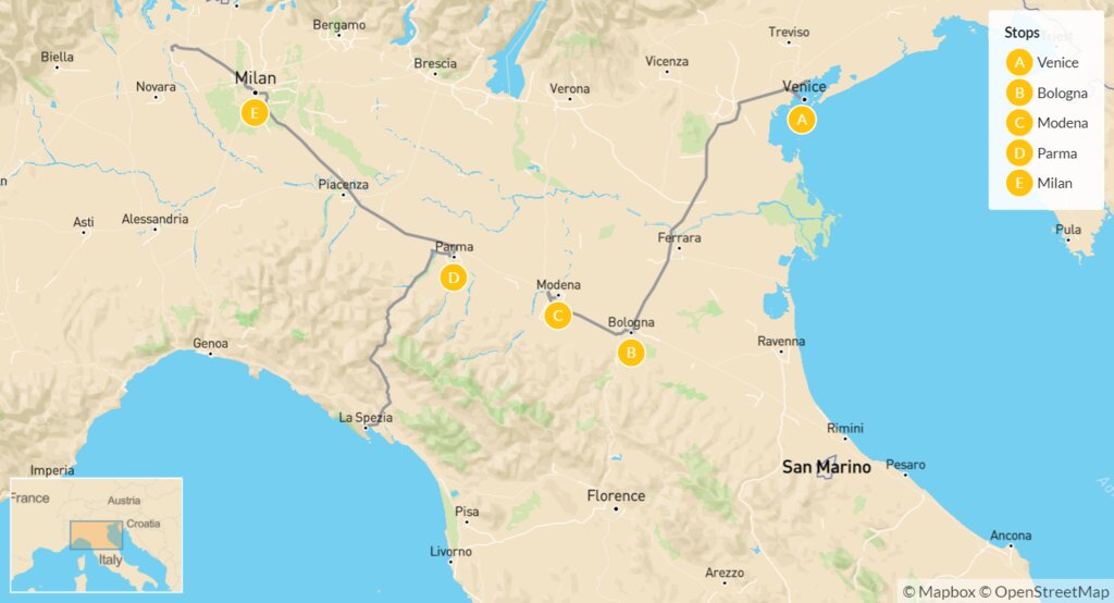 Map of Northern Italian Gastronomy Adventure – 14 Days
