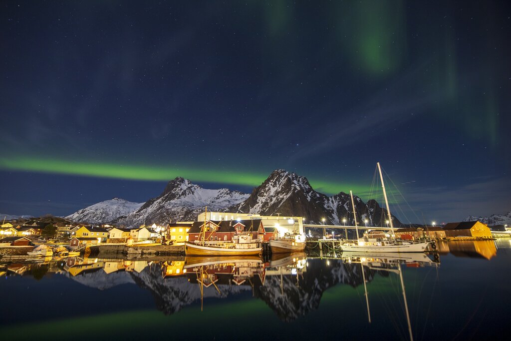 This morning, drive from Senja Island to Svolvær, the gateway to the Lofoten Islands, considered one of the most beautiful archipelagoes in the world. During the winter, there’s no ferry connection in the area that allows for shortcuts between the two islands, so you’ll need to follow the roads along the mainland, which takes around six hours in good weather. Keep track of the weather, make sure your phone is charged (just in case), and time your trip during the daylight hours to maximize your light.
