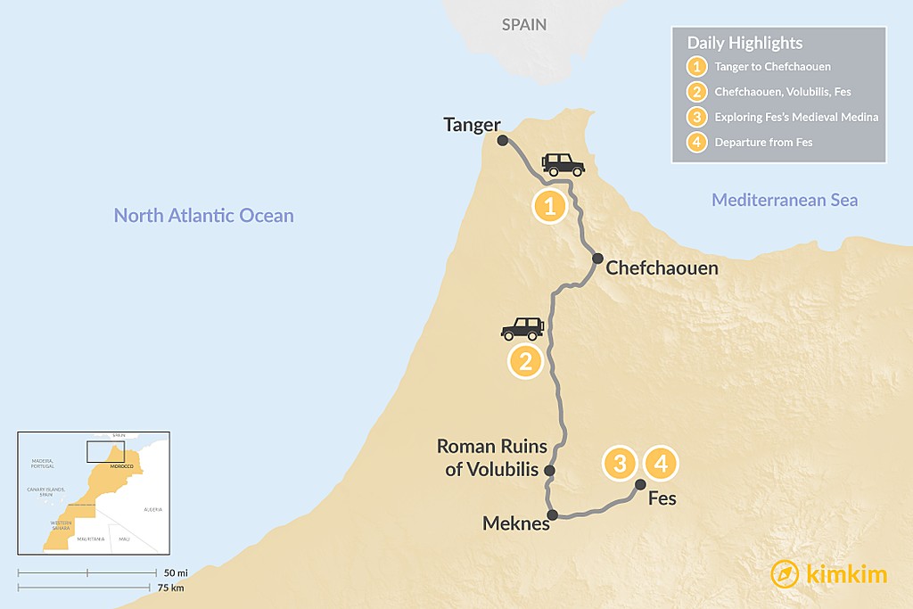 Map of Northern Morocco: Tangier, Chefchaouen & Fes – 4 Days
