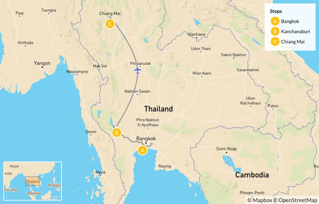 Map of Northern Thailand Family Adventure: Bangkok, Kanchanaburi & Chiang Mai – 10 Days