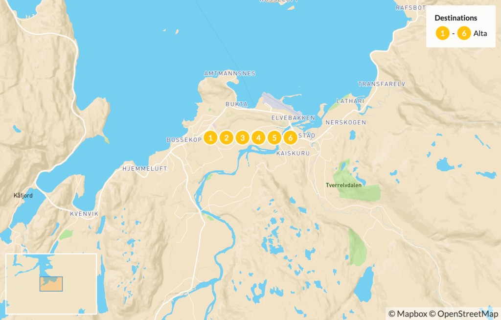 Alta is the largest town in Norway’s northernmost county and lies in the inner reaches of the Alta Fjord. Once you touch down at Alta’s airport, you’ll transfer to your hotel in the city center by taking a short 10-minute taxi ride (alternatively, there’s also an airport bus).