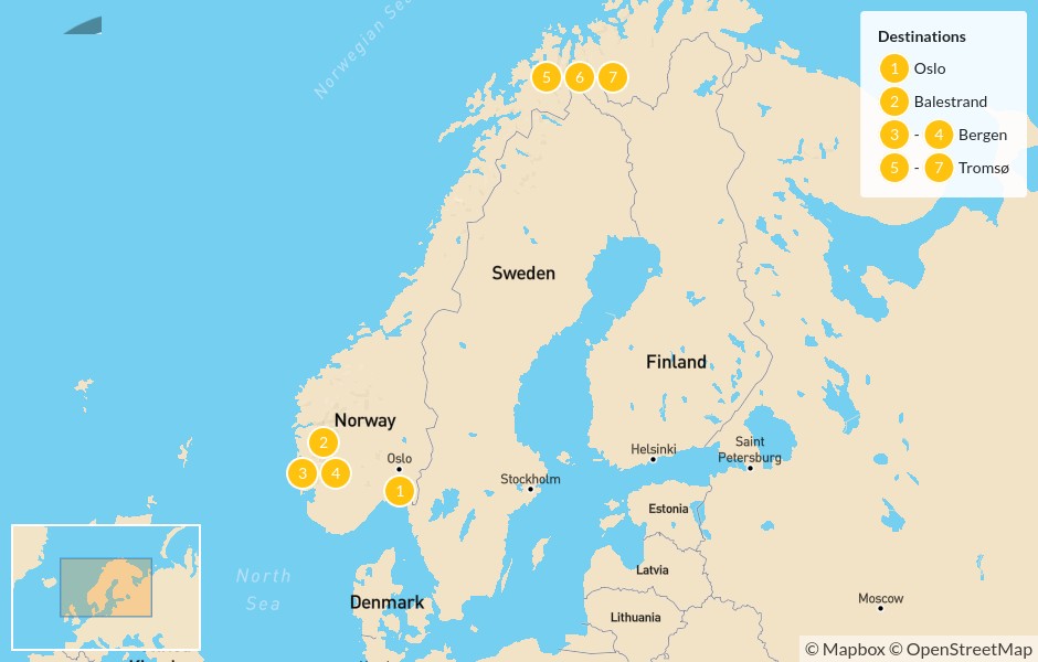 Map of Norway Highlights: Oslo, Balestrand, Bergen, & Tromsø – 8 Days