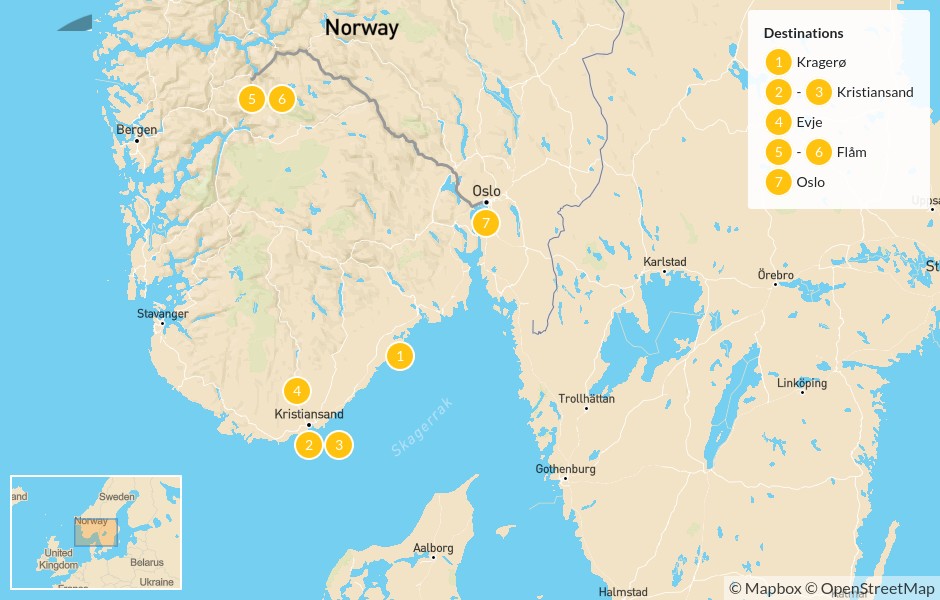 Map of Norway Road Trip: Kragerø, Kristiansand, Evje, Flåm, and Oslo – 8 Days