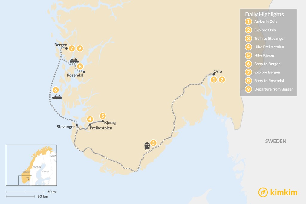 Map of Norway’s Best Cities & Hikes – 9 Days