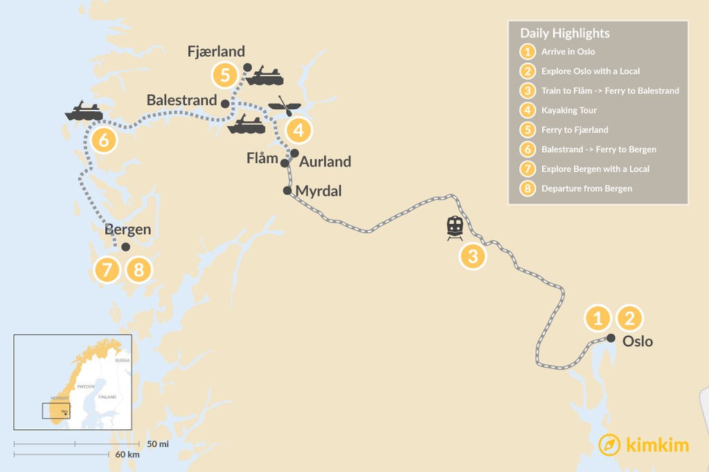 Map of Norwegian Highlights: Oslo, Bergen & the Sognefjord – 8 Days