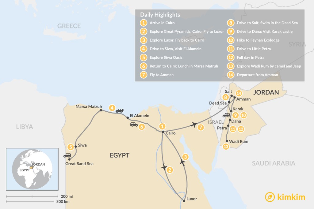 This 14-day itinerary through Egypt and Jordan takes you to places off the beaten path. Explore Siwa, an ancient and isolated urban oasis on the border of the Sahara, hike through the Dana Biosphere Reserve to one the world’s best eco-lodges, and stroll through ancient alleyways in the village of Salt. Of course, there’ll be plenty of time dedicated to visiting cultural and historical attractions like Cairo and Luxor, the Dead Sea, Petra, and Wadi Rum.