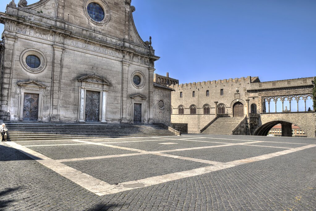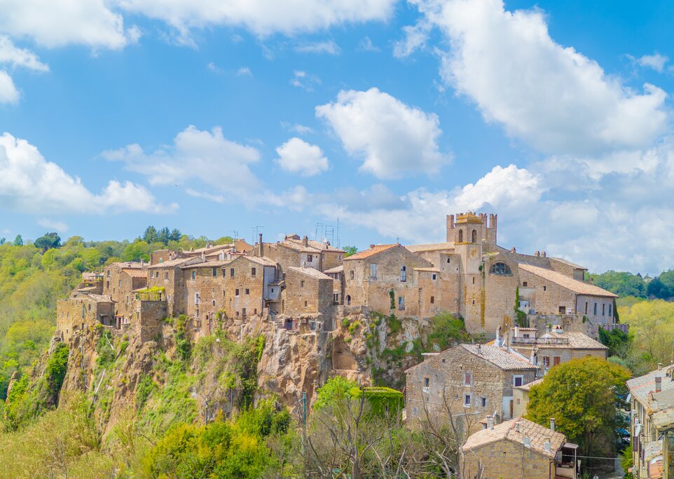 The drive to Viterbo takes about two hours, but you can break up the trip with a stop at Calcata. Also in Lazio, this ancient town sits on a volcanic rock formation rising out of the surrounding forests of the Treja River Valley. Experience its medieval charm as you stroll Calcata’s narrow cobbled streets around the historic center, which abounds with colorful houses and artisan shops. Also, here is San Michele Arcangelo, a humble church whose small size betrays an interior adorned with beautiful frescoes. You’ll quickly discover that the entire town of Calcata is itself a work of art.