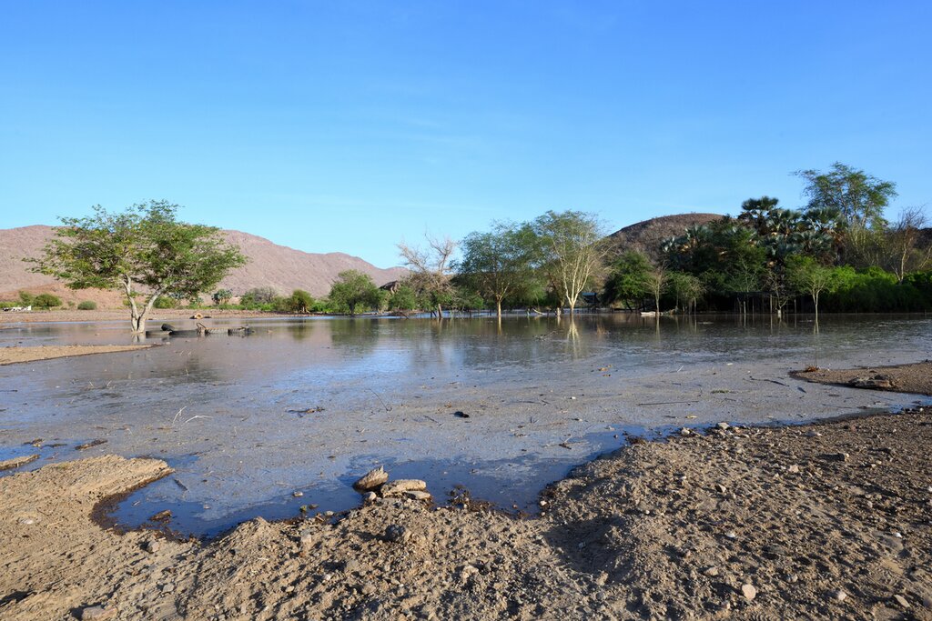 Drive north with your team to Kunene’s capital, Opuwo, to pick up supplies for your trip. You’ll meet the area’s Himba and Herero women who sell fresh produce and handicrafts in the market. Continue your drive, passing Ruacana and traveling along the Kunene River to Swartbooisdrift. Here, you’ll visit the Dorsland Trekkers Monument, commemorating the 1881 Dorsland migration from Namibia across the Kunene River to Angola. Tonight, your team will set up camp by the Kunene River Lodge.