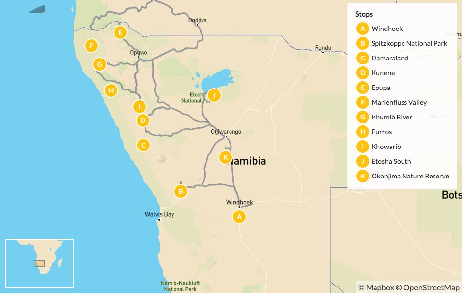 Map of Off-the-Beaten-Track Namibia Adventure – 14 Days