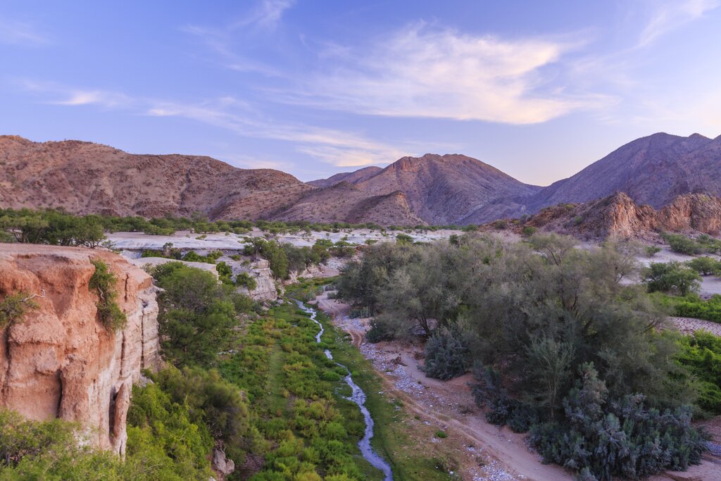 This morning your six-night wild camping adventure begins in Kunene, Namibia’s mountainous northwest. Kunene is a land of endless savannas, valleys, and mountains dotted with villages belonging to Namibia’s Indigenous people. The region is named after the mighty Kunene River, which acts as a border between Angola and has provided a vital water source for the Himba people for centuries. Today, the river is a haven for whitewater rafters, kayakers, and hikers who come to marvel at its crashing waterfalls.