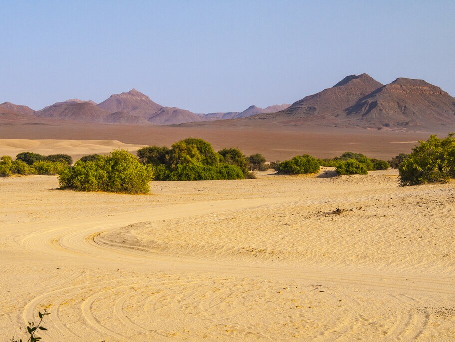 Today you’ll drive south along the Hoarusib, one of Namibia’s most scenic ephemeral rivers. Stop at a Himba village, where a guide will introduce you to the villagers and teach you about their lives as semi-nomadic pastoralists. Learn how the Himba herd cattle and how the women make their emblematic jewelry and thick ochre body powder. You’ll have the chance to shop for Himba handicrafts before you continue to the desert town of Purros.