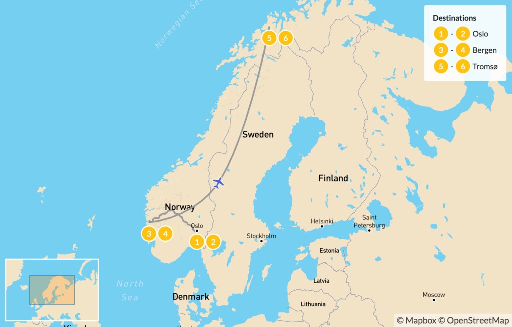 Map of Oslo, Bergen & Tromsø Winter Adventure – 7 Days