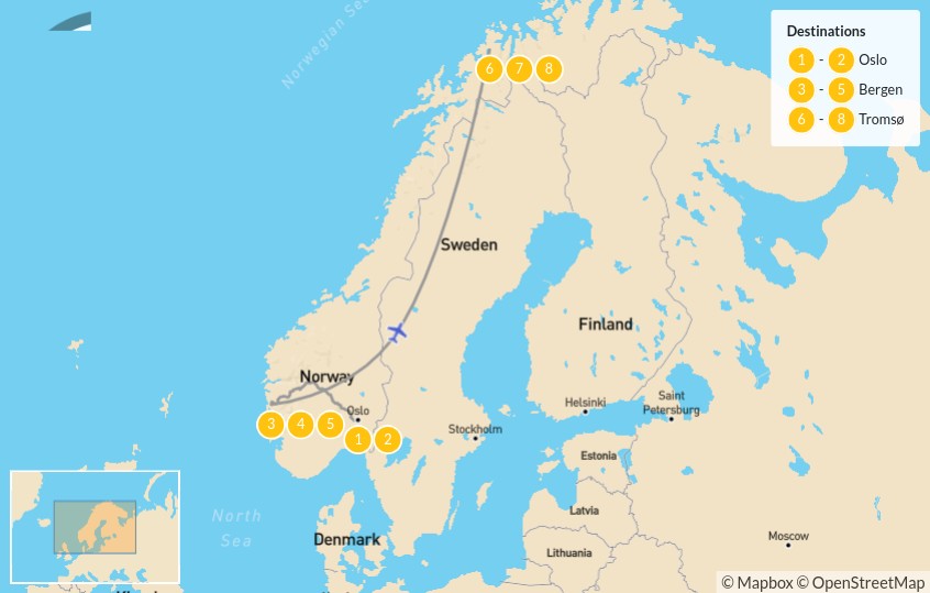 Map of Oslo, Bergen & Tromsø Winter Adventure – 9 Days