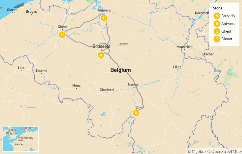 Map of Outdoor Adventure in Belgium: Antwerp, Ghent, Dinant & Brussels – 10 Days