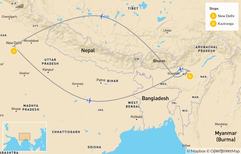 Map of Outdoor Adventure in Delhi & Kaziranga National Park- 8 Days