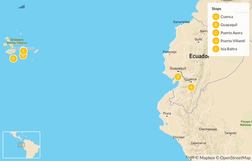 Map of Outdoor Adventure in Southern Ecuador & the Galápagos Islands – 13 Days
