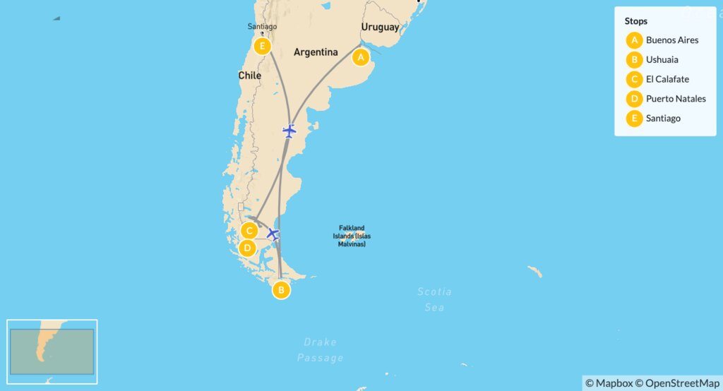 Map of Outdoor Adventures & Cultural Exploration in Argentina & Chile – 14 Days