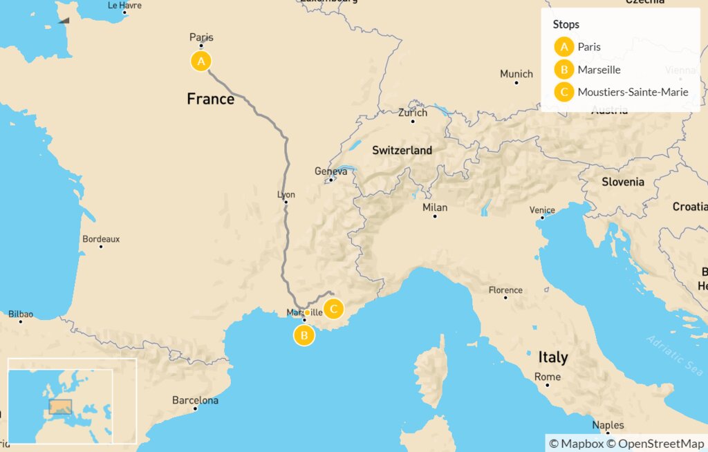 Map of Outdoor Adventures in Provence: Paris, Marseille & Moustiers-Sainte-Marie – 8 Days
