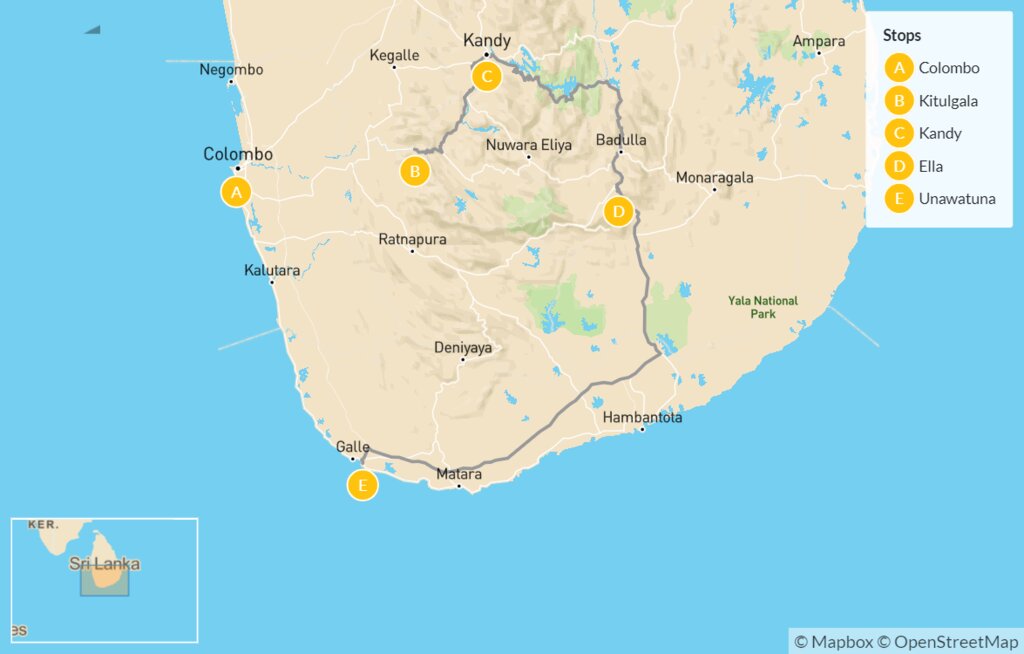 Map of Outdoor Adventures in Sri Lanka: Kitulgala, Kandy, Ella & Unawatuna – 7 Days