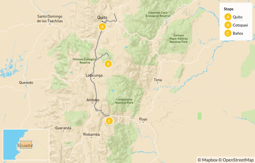 Map of Outdoor Adventures & Luxury in Ecuador’s Highlands: Quito, Cotopaxi & Baños – 7 Days