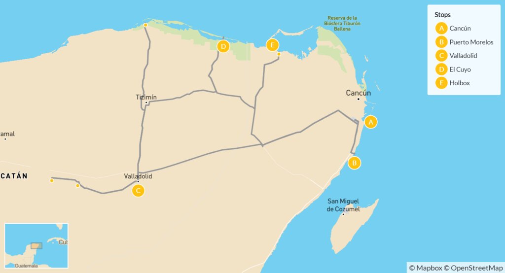 Map of Outdoor Adventures on Mexico’s Yucatán Peninsula: Puerto Morelos, Valladolid, El Cuyo & Holbox – 10 Days