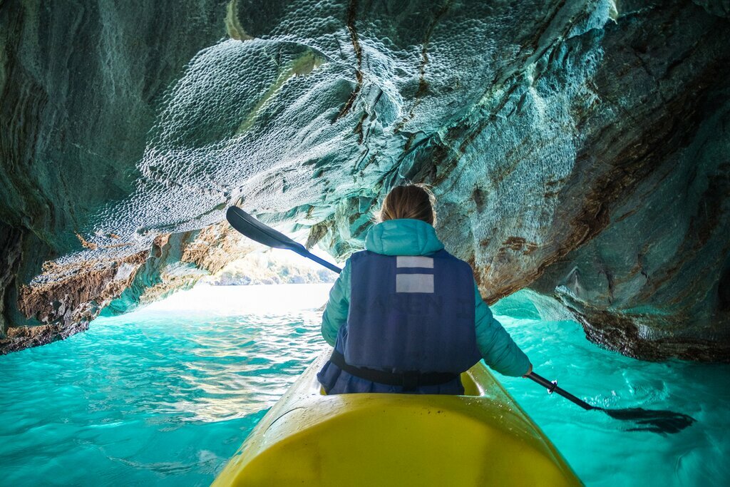 Years of erosion from the lake’s glacial waters have worn down the cave’s limestone walls, creating what is truly a work of art in nature. Your guides will discuss the geology and history of the region as you traverse the turquoise waters, taking in the light-reflecting pools and swirling patterns of the cave walls. After cruising around the caves for a couple of hours, you’ll kayak back to Bahía Mansa and your driver will take you back to town.