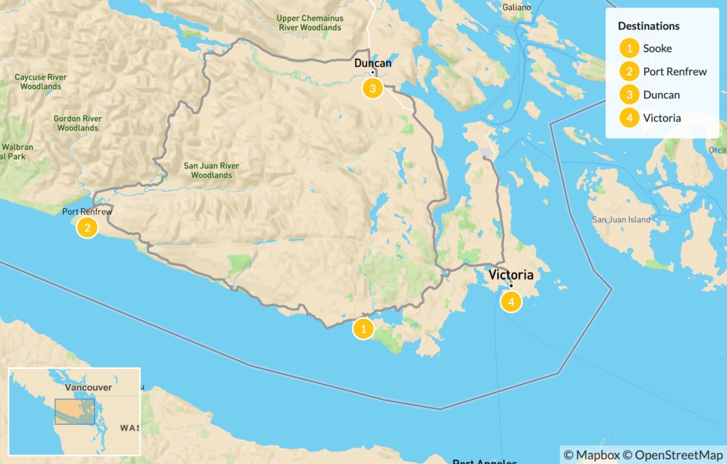 | Day 4 | Cowichan Bay to Victoria (1 hour) | Victoria |