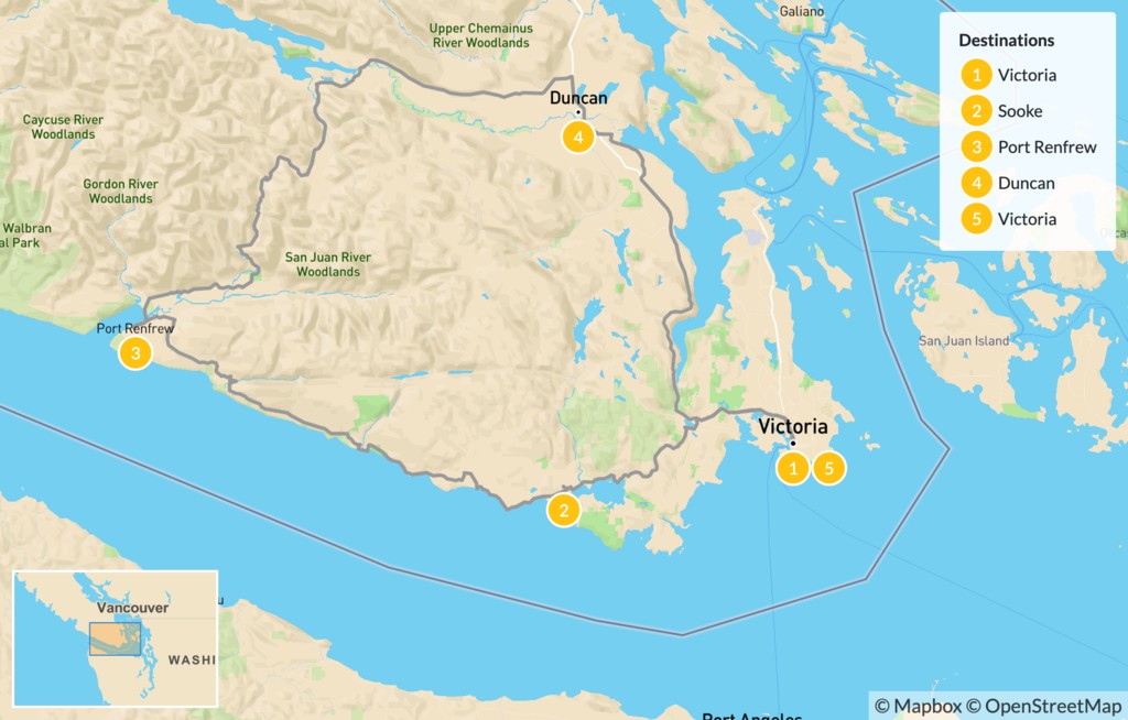 | Day 5 | Cowichan Bay to Victoria (1 hour) | Victoria |