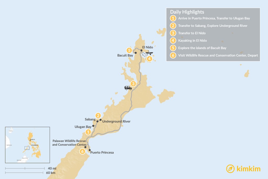 | Day 1 | Arrive in Puerto Princesa, Transfer to Ulugan Bay | Ulugan Bay |