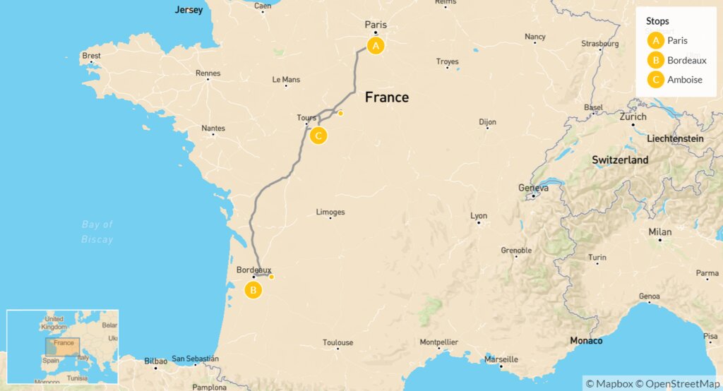 Map of Paris, Bordeaux & the Loire Valley – 10 Days